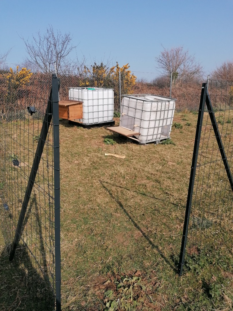 La construction des poulaillers est venue aprés. Des cuves de récupérations de 1000L et du bois pour construire un poulailler avec perchoir et pondoir d'une capacité de 8 poules. Et comme il restait du bois, un petit bac à cendres avec un vieu tiroir !
