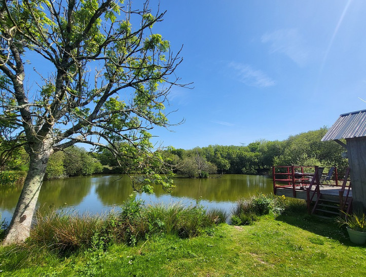 Cabane en bord d'étang avec terrasse en plein cœur de la Hague, à proximité de la mer et de nombreuses promenades.